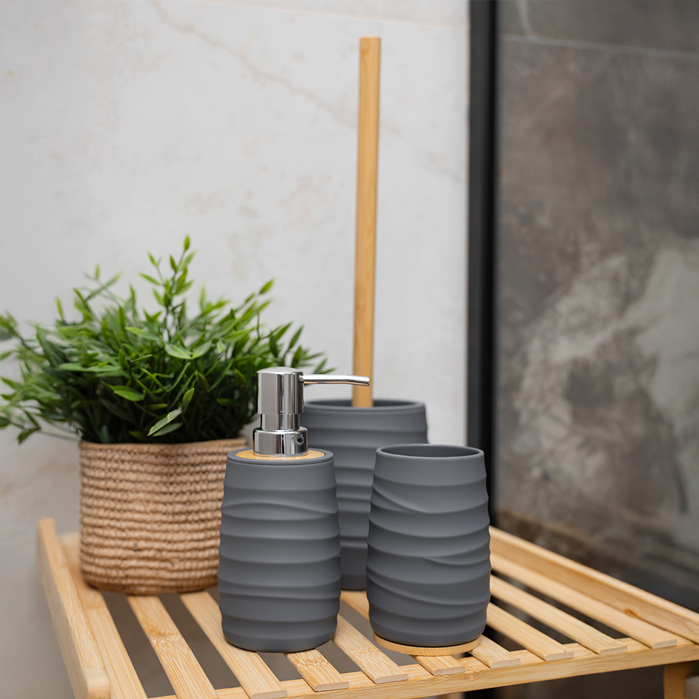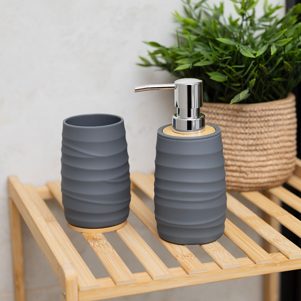 Stylowy szary dozownik AZURO łączy nowoczesny design z naturalnym akcentem, tworząc elegancki i funkcjonalny dodatek do każdej łazienki. Wykonany z trwałego tworzywa sztucznego z subtelnym wzorem, przyciąga wzrok i wprowadza delikatny element dekoracyjny. Górna część dozownika została wykończona bambusem, a chromowana pompka zapewnia wygodne i precyzyjne dozowanie mydła. Model AZURO doskonale komponuje się z innymi akcesoriami z tej samej linii, tworząc spójną i harmonijną aranżację łazienki.