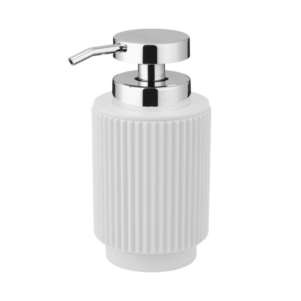 Elegancki dozownik na mydło RIBELLO w kolorze białym to stylowe i funkcjonalne uzupełnienie każdej łazienki lub kuchni. Ryflowana powierzchnia nadaje mu nowoczesny charakter, a srebrna pompka stanowi estetyczne wykończenie całości.