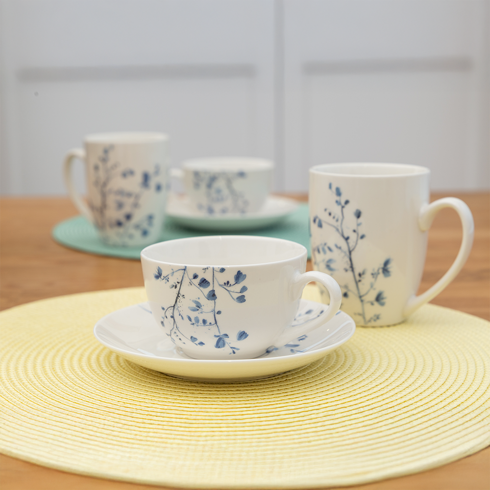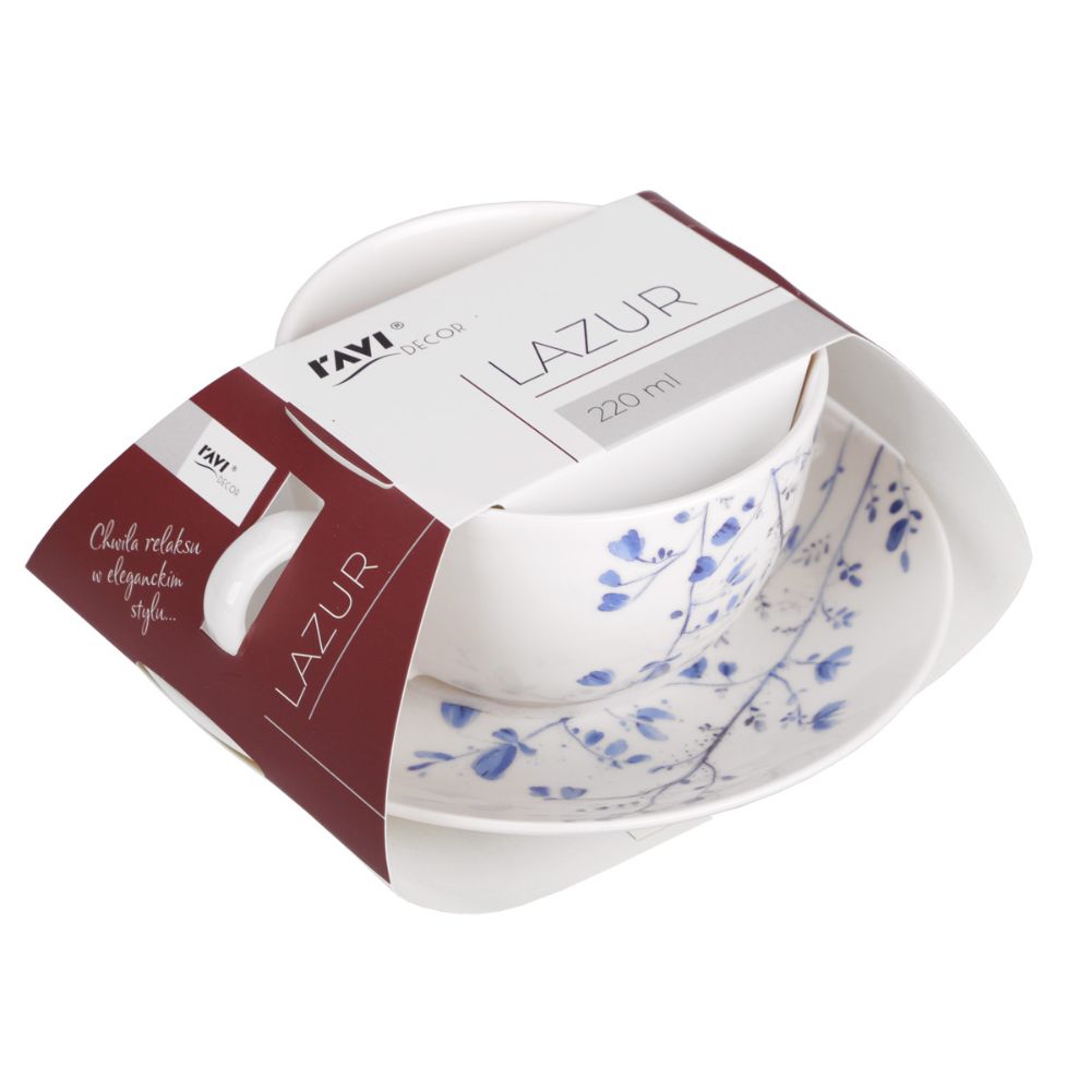 Elegancka filiżanka ze spodkiem LAZUR to doskonała propozycja dla miłośników subtelnych, klasycznych wzorów i wysokiej jakości porcelany. Wykonana z porcelany, zachwyca delikatnym wykończeniem oraz estetycznym wzorem w drobne, niebieskie listki, który nadaje całości lekkości i wyjątkowego uroku.