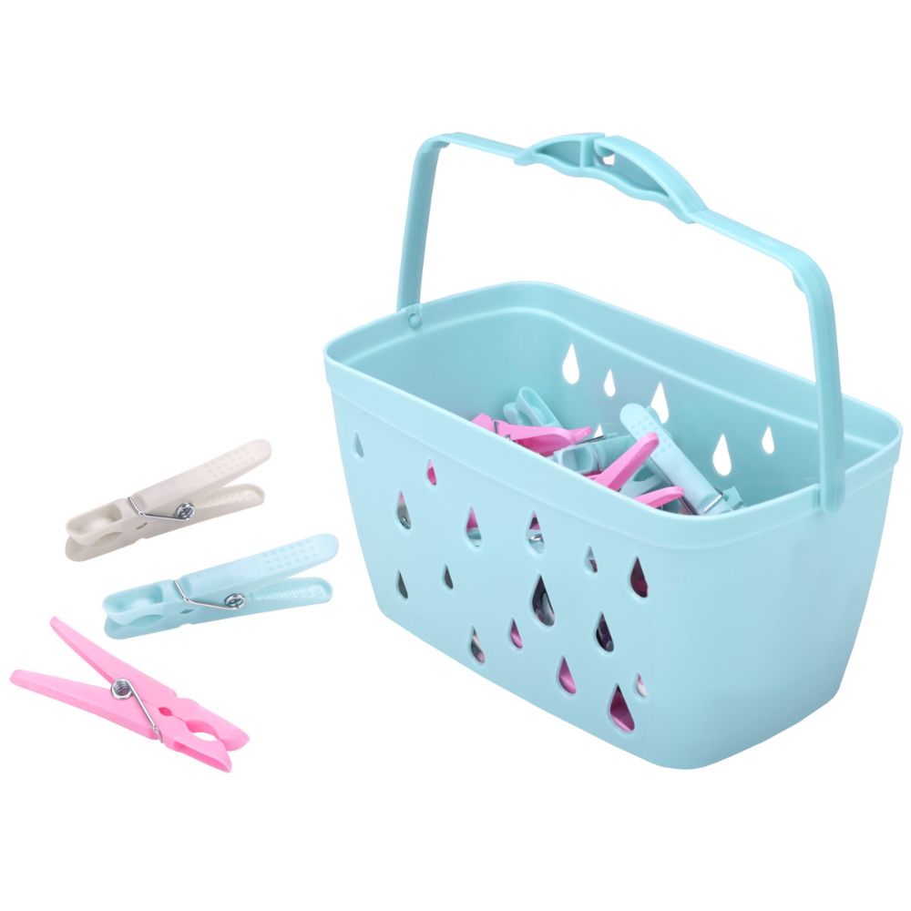 Praktyczny zestaw 30 klamerek do bielizny zapakowanych w wygodny koszyk z uchwytem. Idealne do suszenia ubrań na balkonie, w ogrodzie oraz w domu. Funkcjonalny koszyk ułatwia przechowywanie i przenoszenie klamerek, a perforowane ścianki zapewniają przewiewność.