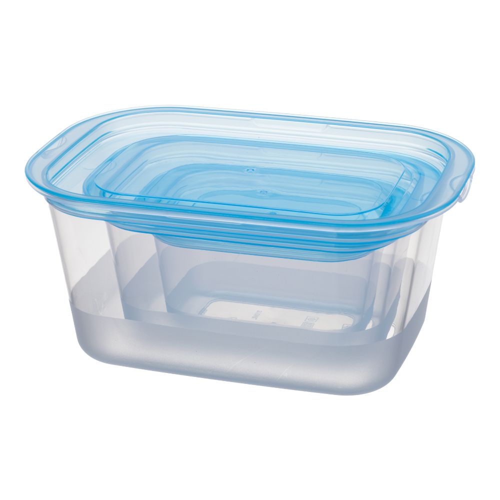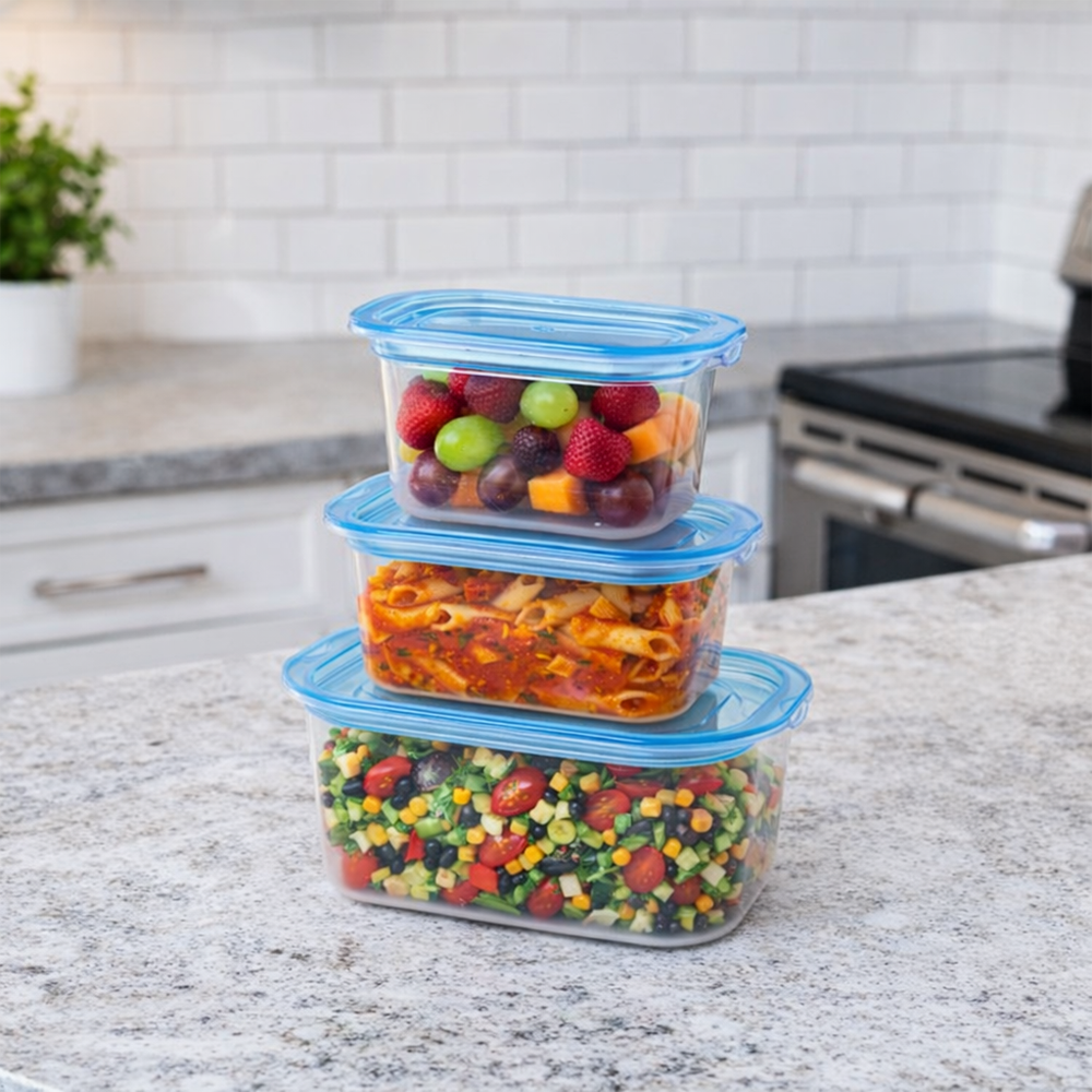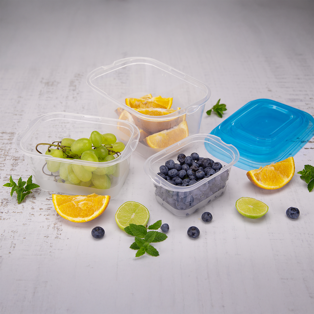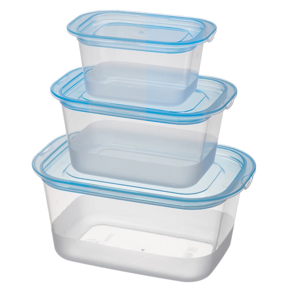 Prostokątny kształt ułatwia przechowywanie i pozwala maksymalnie wykorzystać przestrzeń w lodówce, zamrażarce oraz szafkach kuchennych. Trzy różne pojemności sprawiają, że zestaw jest uniwersalny – idealny zarówno do małych przekąsek, jak i większych porcji obiadowych.
