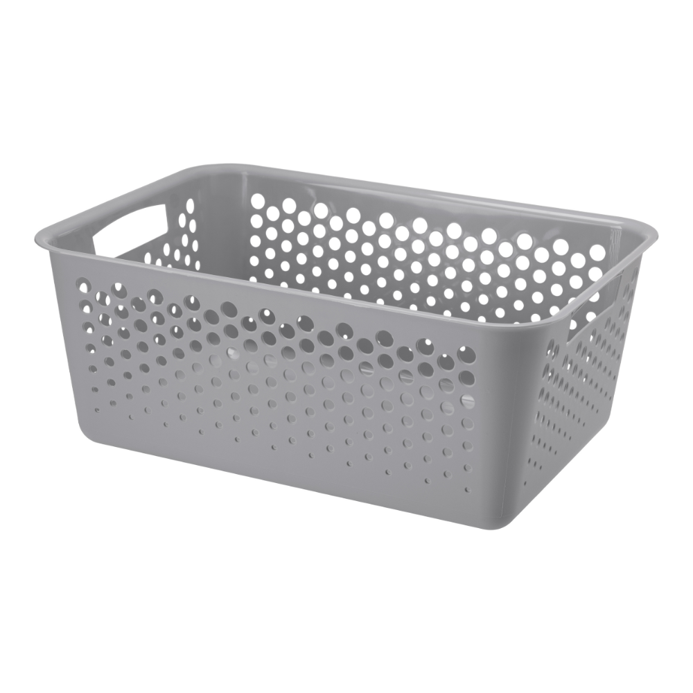 Koszyk wykonany jest z lekkiego i wytrzymałego tworzywa sztucznego. Perforowane ścianki zapewniają dobrą cyrkulację powietrza, co sprawia, że idealnie nadaje się do przechowywania różnych akcesoriów, kosmetyków, środków czystości czy drobnych przedmiotów domowych. Wbudowane uchwyty po bokach ułatwiają wygodne przenoszenie.