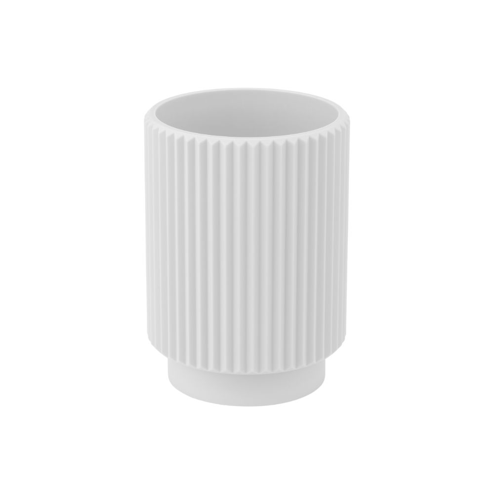 Stylowy kubek łazienkowy RIBELLO w kolorze białym to praktyczny i dekoracyjny element wyposażenia łazienki. Subtelna, pionowa struktura nadaje mu nowoczesny charakter i sprawia, że doskonale komponuje się z innymi akcesoriami z tej samej serii.