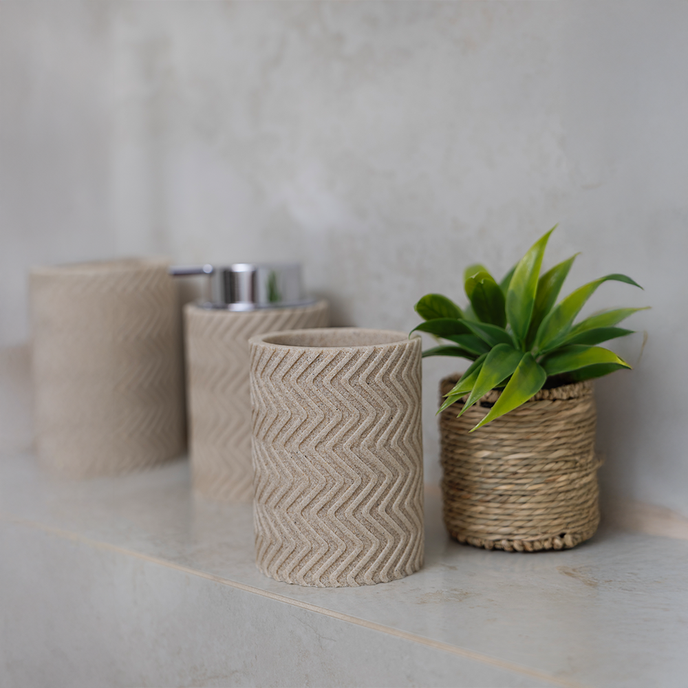 Kubek łazienkowy SANO w kolorze beżowym to idealne połączenie stylu i praktyczności. Wykonany z wysokiej jakości polyresinu, charakteryzuje się dużą odpornością na wilgoć, uszkodzenia oraz odbarwienia. To solidny i estetyczny element wyposażenia, który świetnie sprawdzi się na umywalce – do przechowywania szczoteczek do zębów, pasty czy innych drobnych akcesoriów.