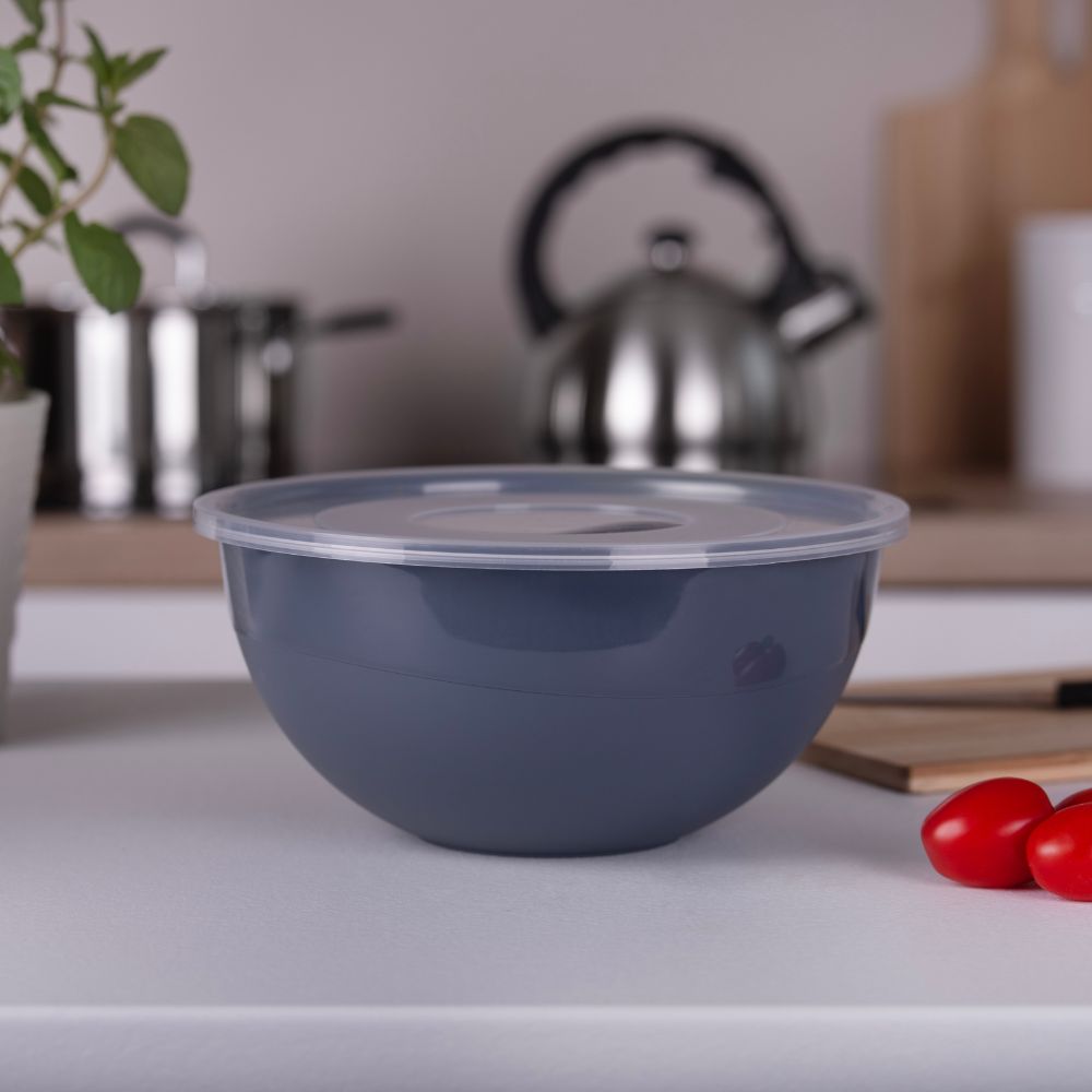 Dzięki pojemności 5 litrów świetnie sprawdzi się zarówno do przygotowywania sałatek, jak i przechowywania produktów spożywczych. Pokrywka w zestawie zapewnia świeżość i ochronę przed wysychaniem, a elegancki grafitowy kolor doskonale wpisuje się w nowoczesne wnętrza. Praktyczna, stylowa i funkcjonalna – ta miseczka to niezbędny element w każdej kuchni!