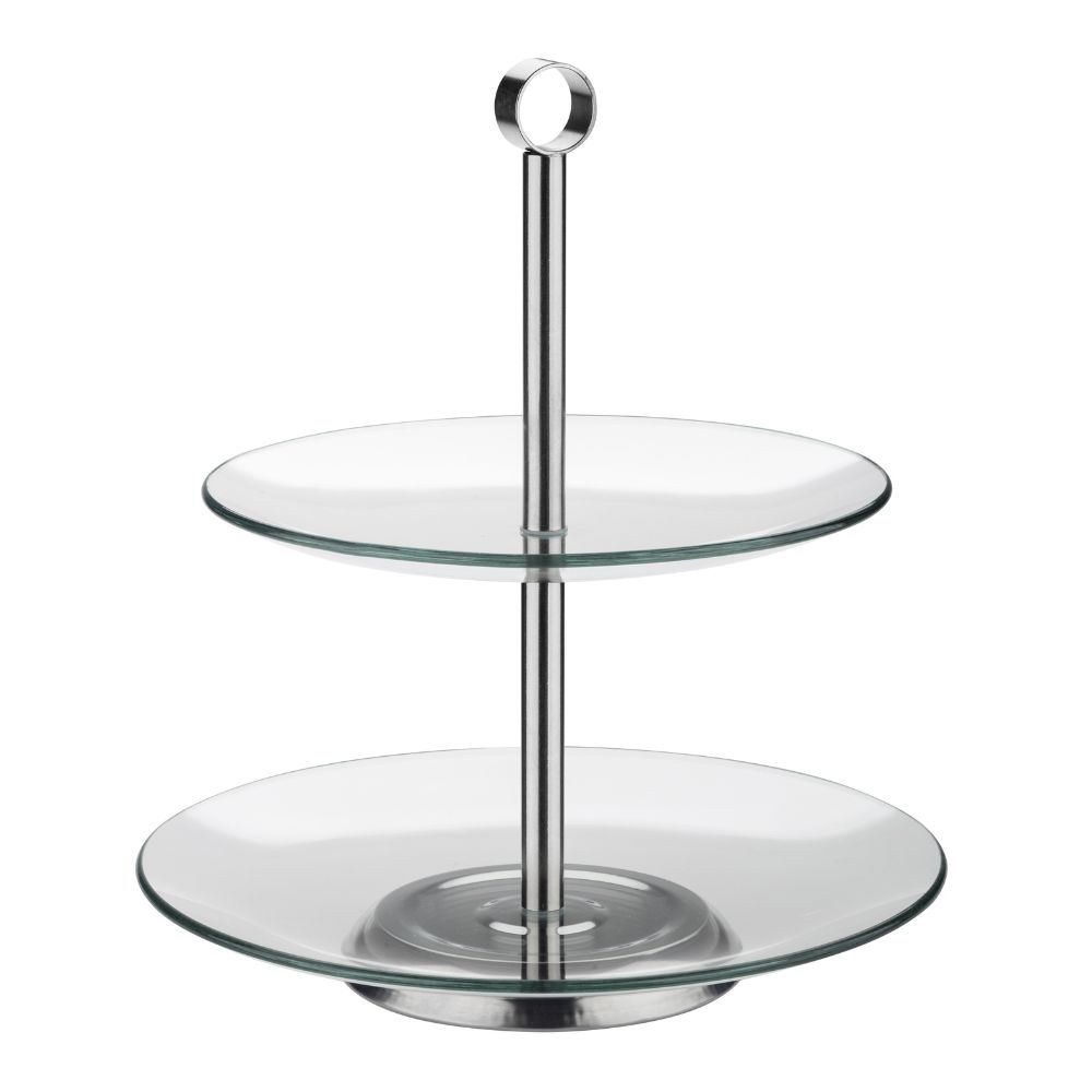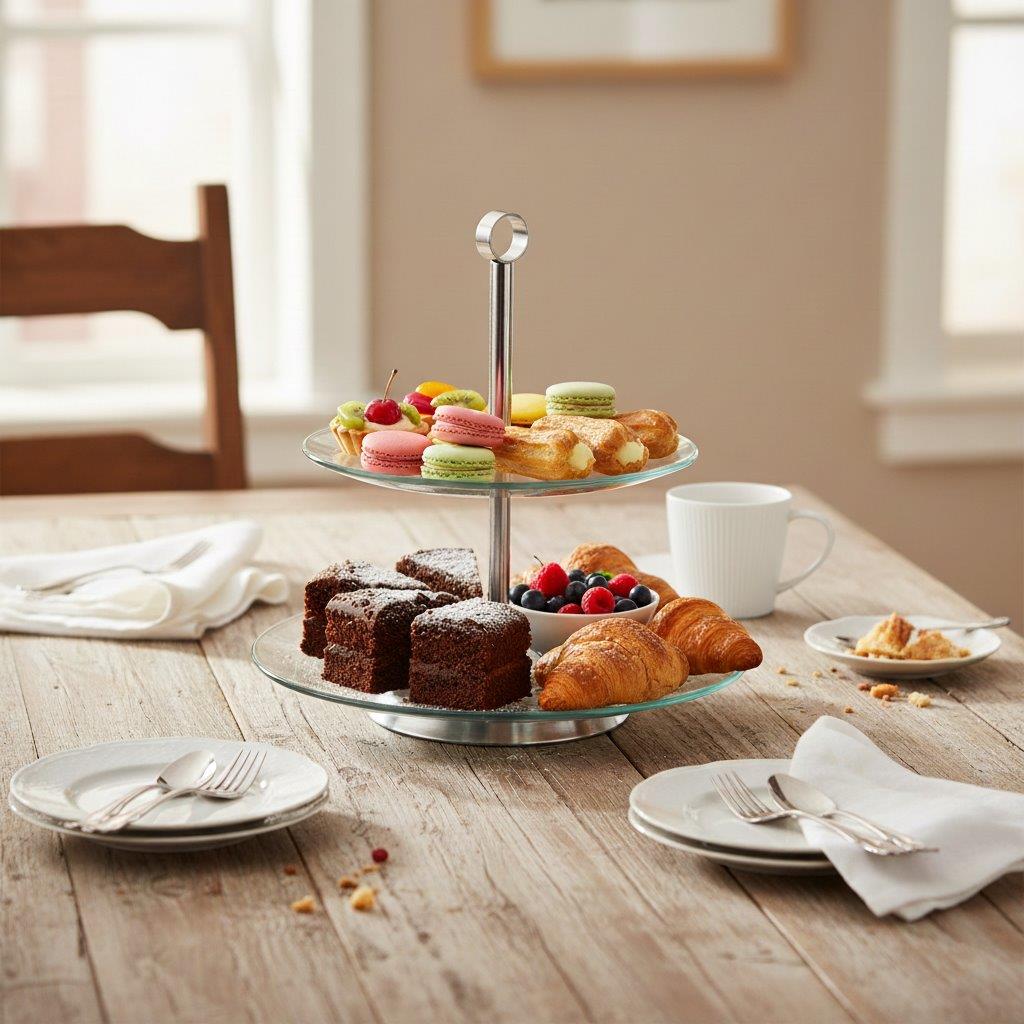 Dzięki dwóm poziomom o średnicy 25 i 21cm, patera pozwala efektownie zaprezentować wypieki i desery, oszczędzając miejsce na stole. Stabilna, antypoślizgowa podstawa ze stali nierdzewnej gwarantuje bezpieczeństwo użytkowania, a całość prezentuje się wyjątkowo elegancko – idealna na przyjęcia, święta i spotkania rodzinne.