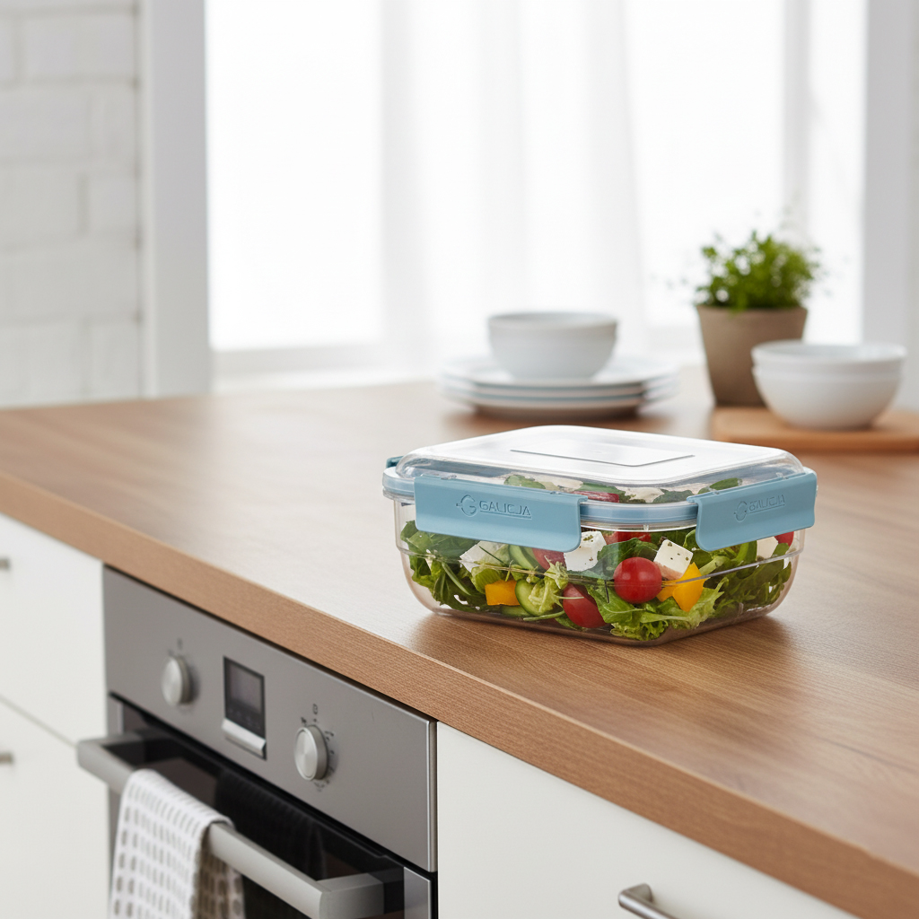 Jego prostokątny kształt pozwala na wygodne układanie w lodówce i szafkach, a pojemność 0,75l czyni go idealnym do przechowywania porcji obiadowych, warzyw, owoców czy suchych produktów.