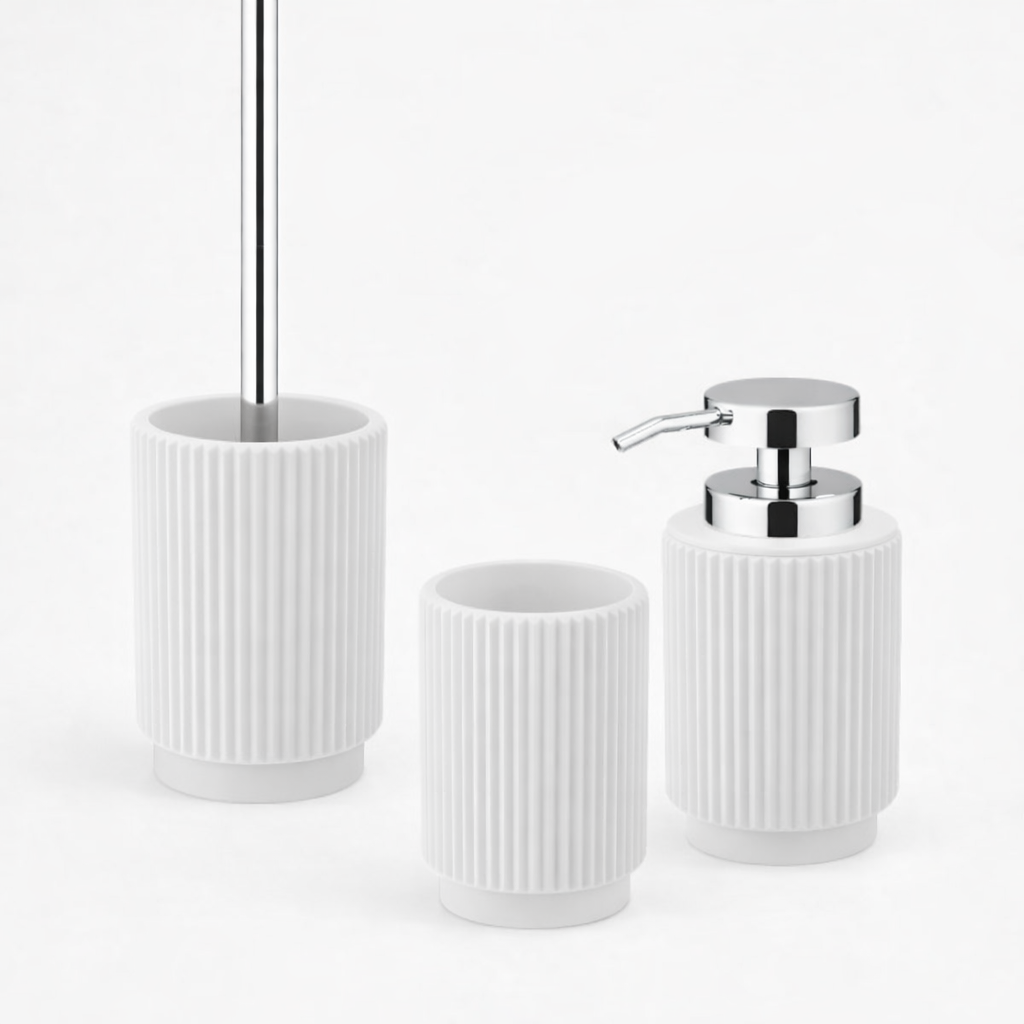 Nowoczesna szczotka WC RIBELLO w kolorze białym to praktyczne i estetyczne wyposażenie każdej łazienki. Minimalistyczna forma oraz pionowe żłobienia nadają pojemnikowi elegancki wygląd i sprawiają, że produkt doskonale wpisuje się w nowoczesne i klasyczne aranżacje wnętrz.