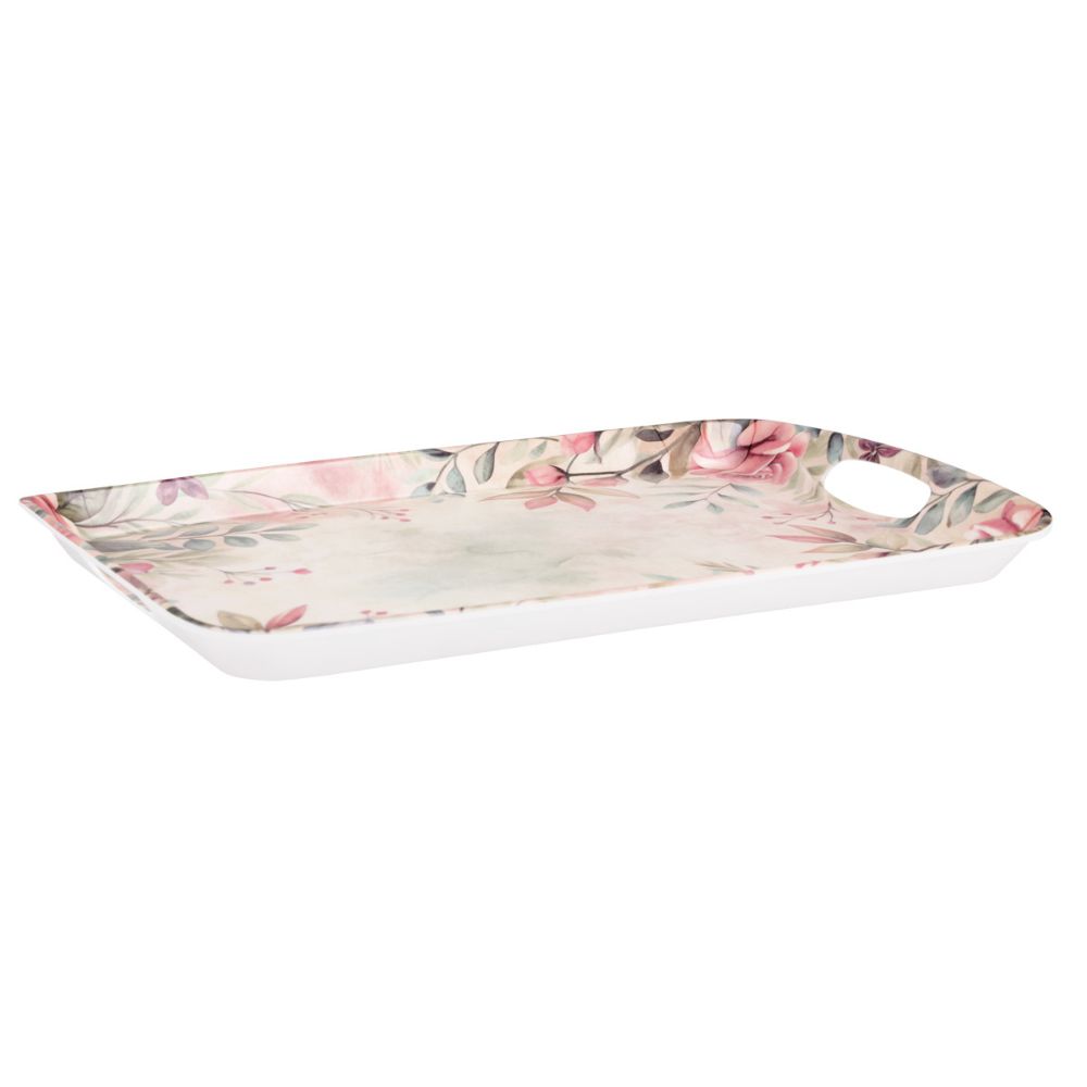 Elegancka taca dekoracyjna to praktyczny i stylowy dodatek do każdego wnętrza. Wykonana z trwałego tworzywa sztucznego, jest lekka, wygodna w użytkowaniu oraz łatwa do utrzymania w czystości. Ozdobiona delikatnymi różowymi wzorami, które nadają jej subtelnego i dekoracyjnego charakteru, doskonale sprawdzi się zarówno w nowoczesnych, jak i klasycznych aranżacjach.