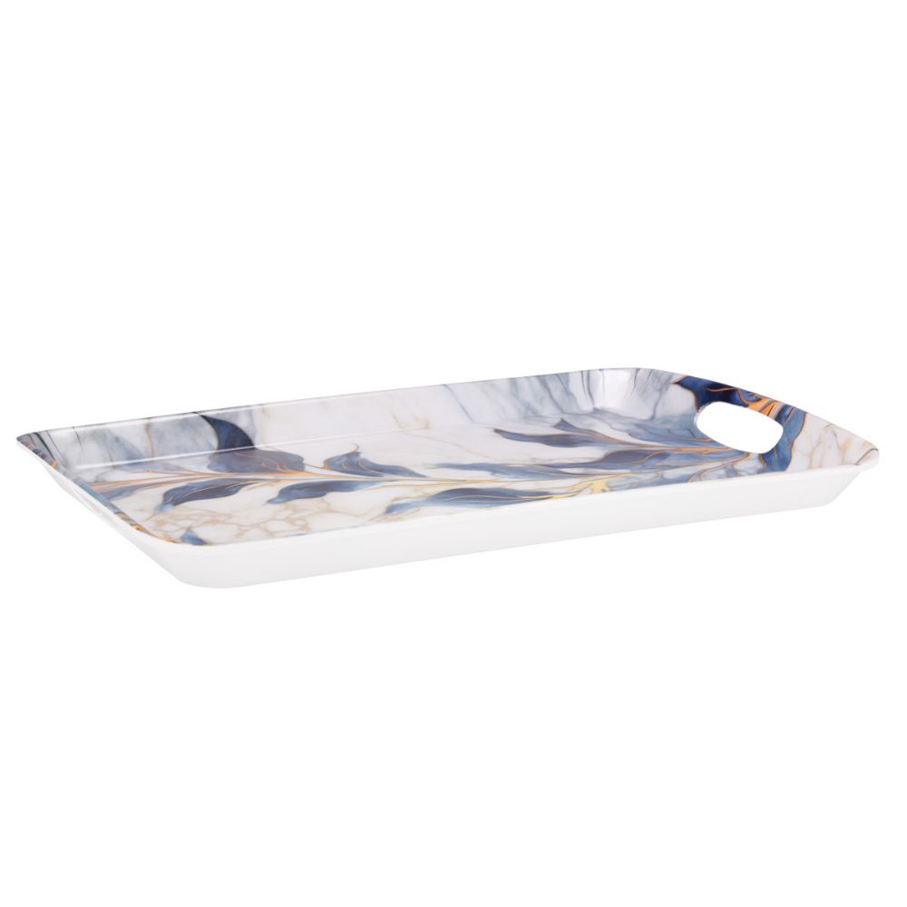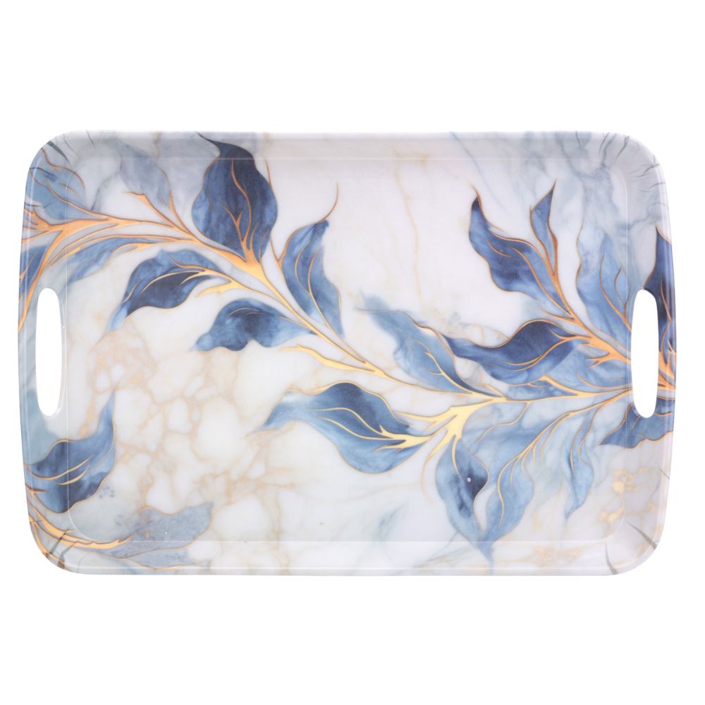 Ozdobiona eleganckimi niebieskimi wzorami, taca wprowadza do wnętrza świeżość i subtelny akcent kolorystyczny. Idealnie nadaje się do serwowania kawy, herbaty, napojów czy przekąsek, a także jako baza pod dekoracje – świece, wazony lub ozdoby stołowe. Uniwersalny design sprawia, że pasuje do kuchni, salonu, jadalni czy na taras.