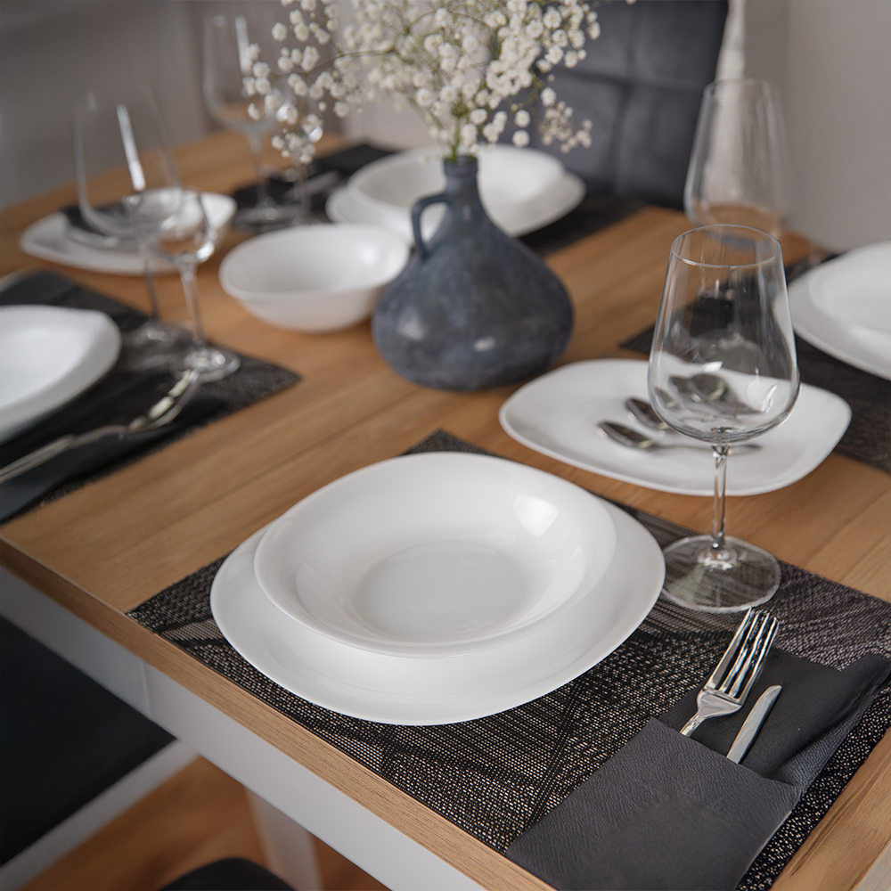 Każda potrawa wymaga estetycznej oprawy, która podkreśli jej wyjątkowy wygląd i zachęci do degustacji. Naczynia z linii Quadro wykonane ze szkła o białej i gładkiej powierzchni idealnie nadają się do tej roli. Uniwersalna biel połączona z delikatnie zaokrąglonym, kwadratowym kształtem będzie stanowić doskonałe tło dla dań o różnej kolorystyce, co sprawia, że wspaniale prezentują się na każdym stole. Naczynia dostępne w kilku rozmiarach i kształtach, dzięki czemu możemy skompletować elegancki i praktyczny zestaw. W kolekcji Quadro znajdziemy: półmisek, 2 salaterki o różnej wielkości oraz talerze - głęboki, płytki i deserowy, a więc wszystko, co niezbędne do serwowania smakowitego obiadu zwieńczonego pysznym deserem.