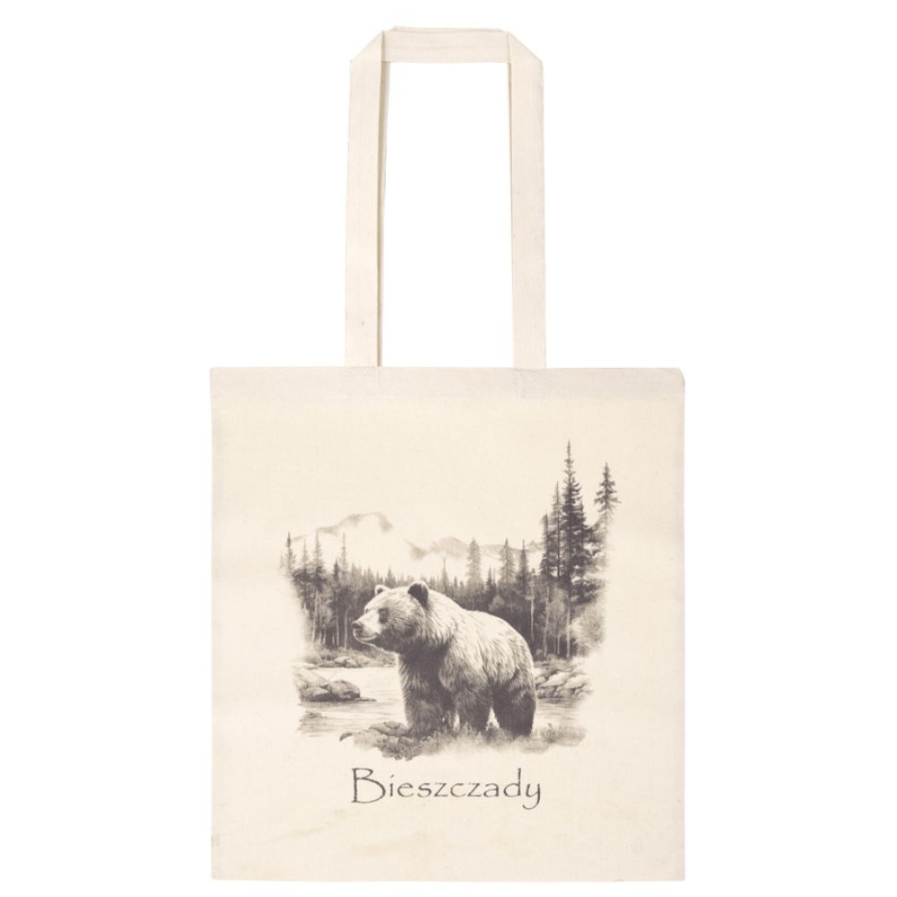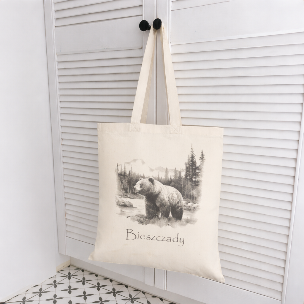 Stylowa torba bawełniana z wyjątkowym nadrukiem inspirowanym naturą Bieszczad. Grafika przedstawiająca niedźwiedzia na tle górskiego krajobrazu nadaje torbie charakteru i podkreśla miłość do dzikiej przyrody oraz górskich wędrówek.