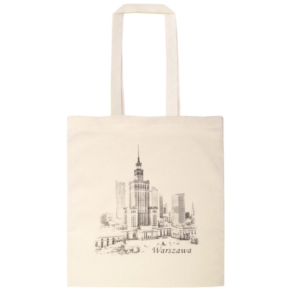 Elegancka torba bawełniana z subtelnym nadrukiem przedstawiającym panoramę Warszawy z charakterystycznym Pałacem Kultury i Nauki. Minimalistyczna, delikatna grafika w odcieniach szarości nadaje torbie nowoczesny i stylowy charakter.